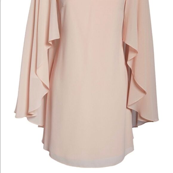 Vince Camuto's striking Chiffon Cape shift Graduation dress is styled with a fabulous chiffon cape overlay NWT flowing, fabulous, and elegant look. Hidden back zipper closure Sheer cape overlay V-neck; Shift silhouette Dry clean Polyester; lining: polyester/spandex nude color light tan/Blush Flowy, Cape Dress, Special Occasion, Wedding, Cocktail, Date Night, Romance, Feminine, Party Dress, Pastel Core, Miley Stewart Summer, glamourous, Fitted Bodice, crepe, Flowy, Floral, Socialite Vibes, Coastal Cowgirl, flouncy, Sears Vintage, Coastal Grandmother, Mother of the Bride, Bridal Shower P to P 18 1/2 Length 36” hips 19” Has stime stretch Made of 94% polyester 6% spandex lining is 100% polyester ** Dramatic Wind Bursts SOLD SEPERATELY! ;- Drama, meet versatility. This timeless layer designed. clean, structured drape. silhouette sleek, . luxe flowy glam