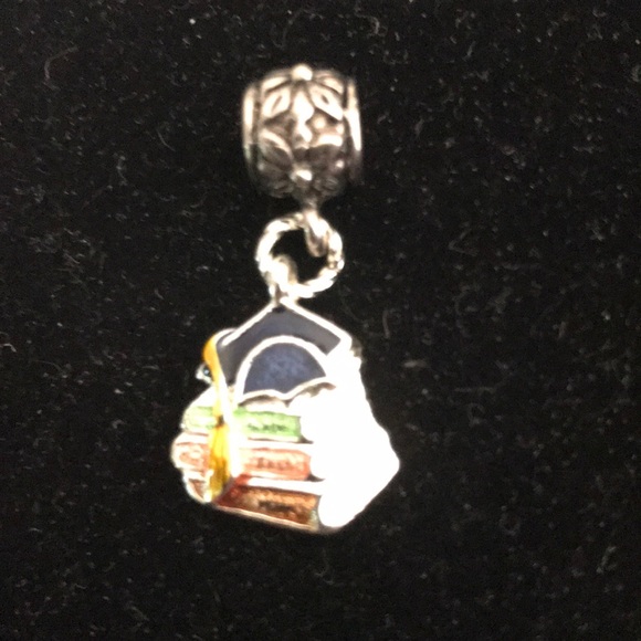Great gift for your graduate. Is a stack of books green, pink, tan colors with blue graduation cap and gold tassel on top. Adorable charm.