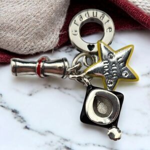 Celebrate achievements with this graduation charm. Features a black cap, gold star, and diploma with red bow.