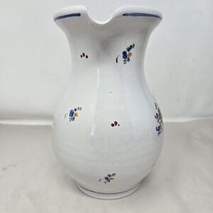 This beautiful handmade pottery vase pitcher is a unique addition to your collection. The white base is adorned with delicate hand-painted floral patterns, giving it a cottage core style. Measuring at 4.25 inches in length, 7.5 inches in height, and 4 inches in width, this Austrian-made vase is lightweight at 2 pounds.