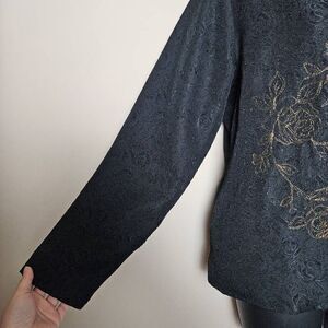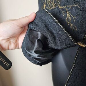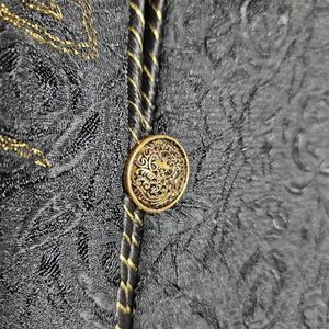 This is a vintage jacket by Graff by Um. It is black with textured black floral detailing. There is gold floral embroidery on this jacket, as well as brass tone buttons with filigree. The inside of this jacket has a solid black lining. This jacket has light shoulder pads.