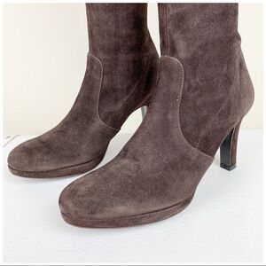 Graffiti Women’s Brown Suede Heeled Platform Boots w/Suede Wrapped High Heel Sz 37.5. Good used condition, with minimal wear to sole and some scuffs on the suede as shown. 14” shaft 3.25” heel 11” circumference at top. Made in Italy. Would be cute with some retro or boho peasant skirts. Or a mini with a sweater! Please see photos for additional details.
