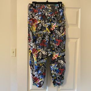 Gently preowned cropped jogger style graffiti pants. Has pockets and 4 fake pockets (2 one each side of the legs) and 2 in the back.