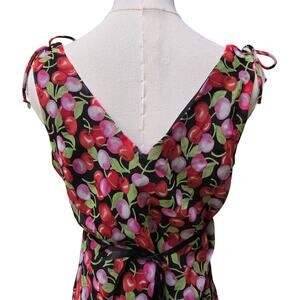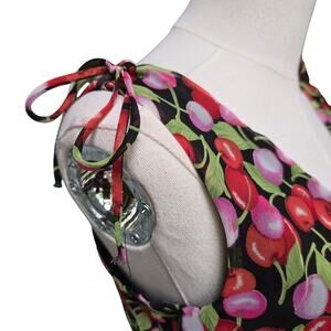 cherry print dress, pinup style dress, retro fruit dress, 90s y2k aesthetic, rockabilly dress, Graffiti NY vintage, summer party dress, V-neck cherry midi, red fruit print dress, black halter swing dress