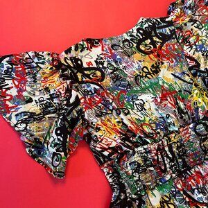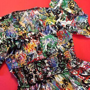 Graffiti Print Punk Top with Ruffled Sleeves, Size M – Bold and Edgy Statement
