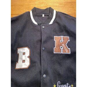This jacket combines style and functionality for sports enthusiasts. Featuring bold lettering and unique patchwork, it offers warmth and a sporty vibe. Ideal for casual outings or chilly game nights, adding a statement to your athletic wardrobe.