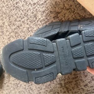 Stylish black high-top sneakers featuring bold white lettering on the sole.