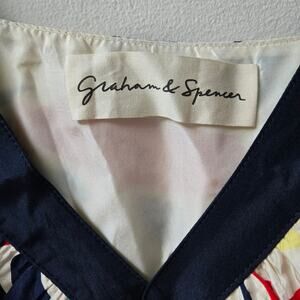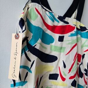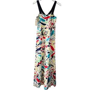 Graham & Spencer NEW colorful silk sleeveless v-neck maxi dress with contrasting navy blue straps and vibrant abstract multi-color pattern-- lightweight, flowy effortless drape and airy feel. Fully lined, made in the USA. Rare, sold out style, no longer in stores.