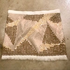 Graham & Spencer beaded, embellished, fun, party skirt! It’s my favorite, but I don’t fit into it any more. Rose gold studs with gold and ivory sequins. Fringed hem with a zipper back closure