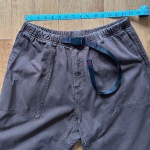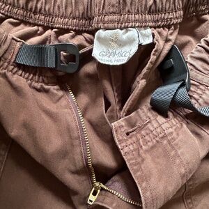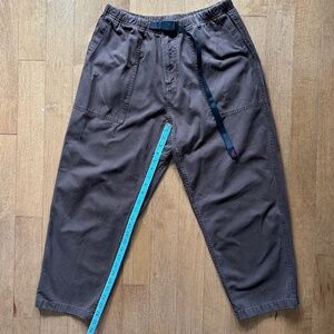Gramicci loose tapered pant in brown. They have a built in belt and flexible waistband. And they have two velcro back pockets and two front pockets. Great condition. Size large.