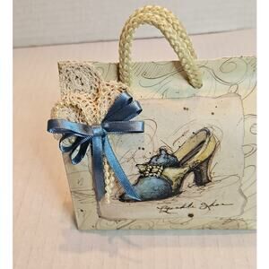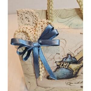 Embellished with Cotton lace, pearl type beads and blue satin ribbon. 4.5" wide, 4.5" tall, 2" depth.