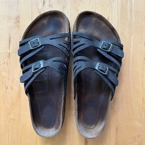 I LOVE Birkenstocks. Wear them year round and in my house as slippers for great arch support. But I never loved this style. Worn, but in great condition. The leather is an oiled black color. Make an offer!
