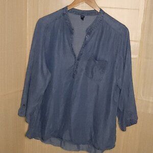 Grand and Greene women’s blue flowy plus tunic top 1X. Gently used condition. Measurements are: 21 ½" sleeve, 29” from shoulder to shortest part of hem, and 26” from armpit to armpit.