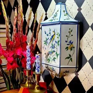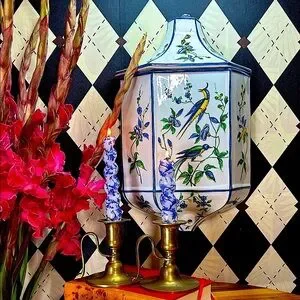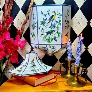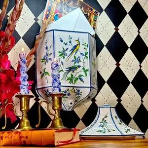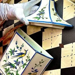 - Hand-painted chinoiserie motifs of exotic songbirds and flowering branches