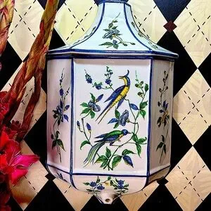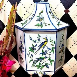Striking in scale and artistry, this grand chinoiserie ceramic wall pocket + LID transforms any space with its presence. Adorned with hand-painted phoenix, exotic birds and flowering vines in vivid hues of blue, yellow, and green, it embodies the elegance and decorative richness prized by collectors of fine chinoiserie.