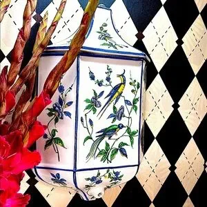 chinoiserie ceramic wall pocket, hand-painted exotic bird porcelain, blue and white wall planter with florals, grand ceramic chinoiserie décor, collector chinoiserie wall accent, decorative ceramic wall vessel, chinoiserie home styling, hand-painted bird and vine porcelain, large statement chinoiserie pottery, blue green yellow floral ceramic, timeless chinoiserie collectible wall décor