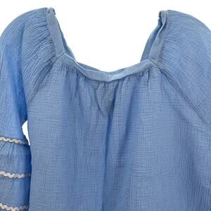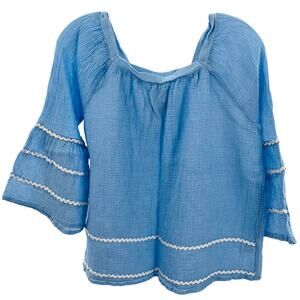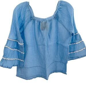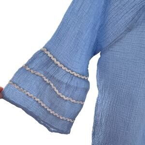 Grand & Greene Blue Long Bell Sleeve White Trim Crop Square Neck Boho Top S