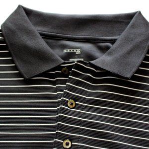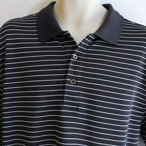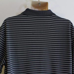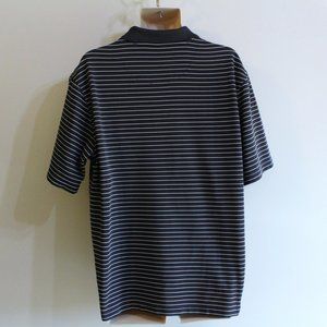 This polo golf shirt is nice in quality. It is gray and white stripe with textured horizontal lines. It has a solid gray collar and 1/4 button front. It is in excellent/near to new condition. Please note the stamped sizing label has peeled, showing only part of the brand name/size.