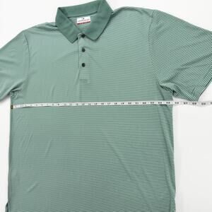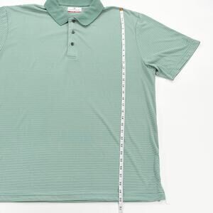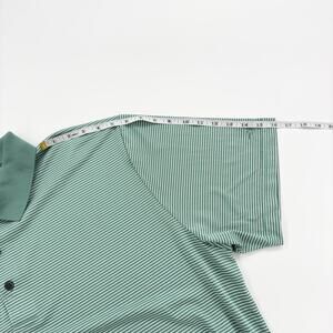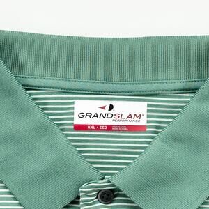 This Grand Slam Performance Polo in size XXL features green and white stripes, perfect for casual wear or sports. Made from lightweight, breathable material, this polo ensures comfort during any activity. It has a 3-button placket and a classic fit. The dimensions are shown in the pictures for precise fit reference. This shirt is in excellent pre-owned condition with no visible stains or defects.