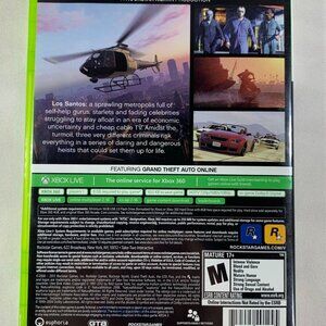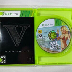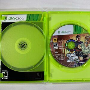 Grand Theft Auto V for Xbox 360, complete set that includes 2 game discs, map, and manual. A thrilling adventure by Rockstar Games with a Mature 17 Plus rating.