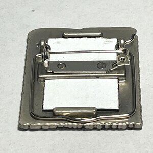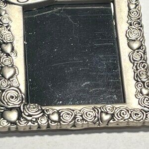 Ornate silver brooch featuring roses and hearts, designed as a miniature picture frame. Hinged back allows easy attachment. Sentimental gift idea.