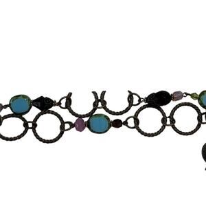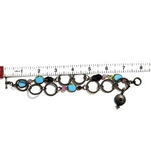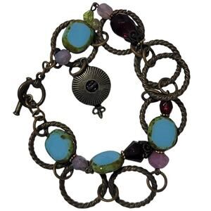 This classy bracelet is made of oxidized metal (faux brass) and includes a variety of colorful beaded charms. The company, "Grandmother's Buttons," was founded by Susan Davis, a jewelry maker that repurposes beads and/or charms. Later, these beads are chosen and then hand assembled by her team of workers. The completed bracelet (in this case) looks like a combination of two intertwined bracelets and suggest both an antique and industrial look. This bracelet is pre-owned and in great condition. It's approximately 7 and 3/4 inches in length, and has a toggle clasp.