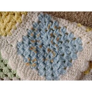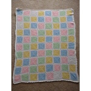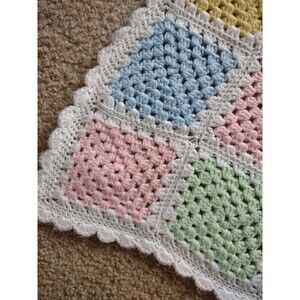 Create a luxurious look in any nursery or living room with this hand-crafted granny square afghan. Its pastel colors, granny squares, and intricate scalloped edge make it the perfect soft baby blanket you've been looking for. Measures 46" x 37" CONDITION: has small stain on one side in the corner ( see photo)