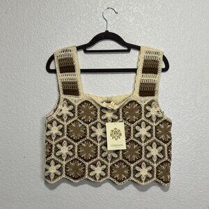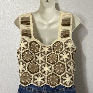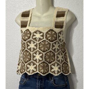 Granny Square Crochet Tank Top Brown Cream Y2K Boho Size S