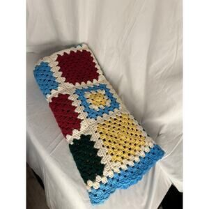 Vintage Crochet Granny Square Blanket Maroon, Blue, Yellow, Dk Green and White trim , Vintage Hand Knit Throw Blanket, Handmade Warm Couch Throw, Vintage Crochet Throw Approx. 47" x 57". Note some discolored spots in photos. Besides those in good vintage condition.