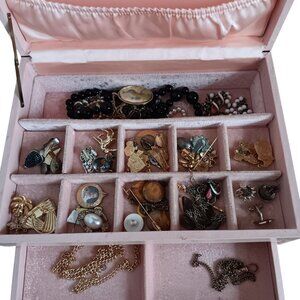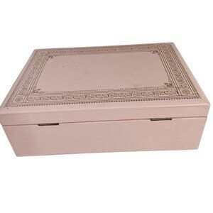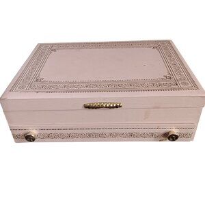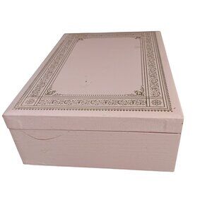 A vintage jewelry box with elegant gold detailing, this piece features multiple compartments and a drawer, perfectly organizing your treasured items. The plush interior provides a soft resting place for jewelry, ensuring protection and easy access. Its classic design adds a touch of sophistication to any dresser or vanity.