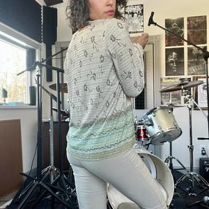 Silky soft cardigan coverup in muted green, brown, and turquoise. Long sleeve, front buttons, with paisley and leaf design. Tag is cut out so no brand or size. Shown oversized on a small.