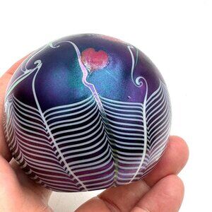 Grant and Randolph Studios deep Cabot Blue swirl and red heart design paperweight. Handcrafted and unique, perfect for collectors or as a gift.
