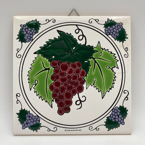 Vintage decorative grape ceraminc tile from Vasil & Black 1987. Tile is in excellent vintage condition with no visible chips or cracks and is fully glazed with a felted back and metal hanger. This is a collectible piece that would make a great gift.