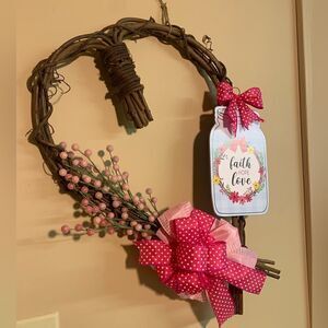 Heart with Faith, hope, and love sign. Also pink beads and two ribbon bow. Perfect for Valentine’s Day