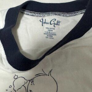 100% cotton t-shirt with navy ribbing and graphic. Shrunken fit. Fits like a size small.