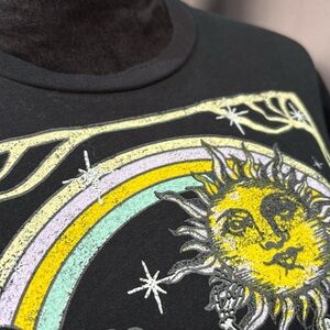 Explore your style with this black tee featuring a vibrant graphic print. Perfect for casual outings.
