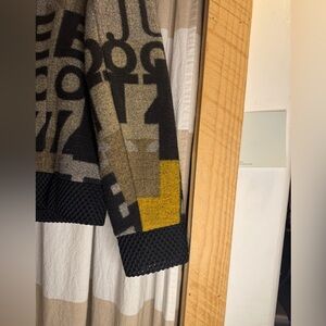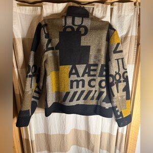 Stylish zip-up jacket with a bold graphic pattern. Features black, tan, and yellow colors.