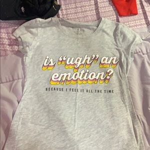 It’s a gray t shirt with a silly saying. It’s cute for middle or high schoolers looking for a shirt to grab attention.