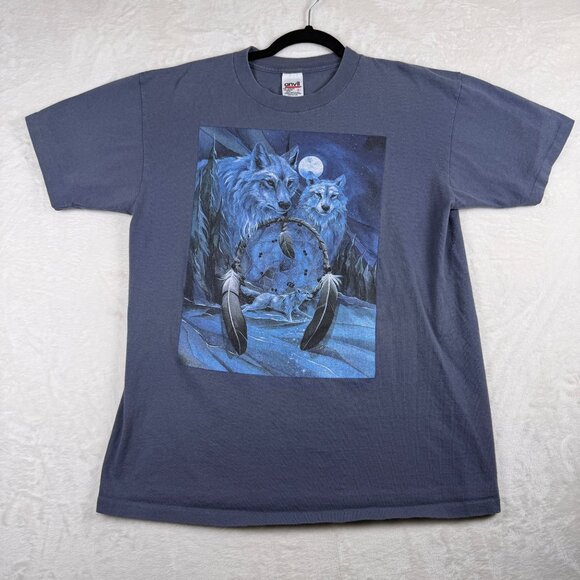Graphic T Shirt Wolf Dreamcatcher Blue Unisex Size L Spiritual Nature