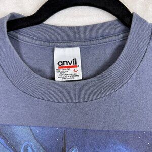 This listing is for a vintage-style graphic t-shirt featuring a wolf and dreamcatcher print under a moonlit sky. The color is a faded slate blue. Tag reads size Large. Brand is Anvil. Made from 100 percent cotton, pre-shrunk fabric made in the USA and assembled in Honduras.