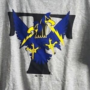 Show off your style with this Majestic short-sleeve graphic T-shirt! Featuring a bold blue and yellow eagle design on a classic heather gray background, this tee is a great addition to any casual wardrobe.