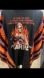Black graphic tee featuring a bold design with crochet sleeves in orange, pink, and black.