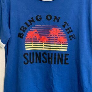 Details: Graphic Tee in Blue with White trim. Bring on the sunshine printed on the front. Oversized fit is perfect for the summer months. Can be used as a beach tee or swim coverup.