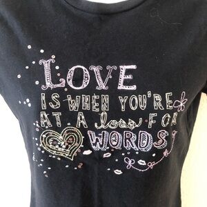 Black T-shirt, wording says “love is when you’e at a loss for words”, decorated with stitching and sequins, small tiny fit, Old Navy brand.