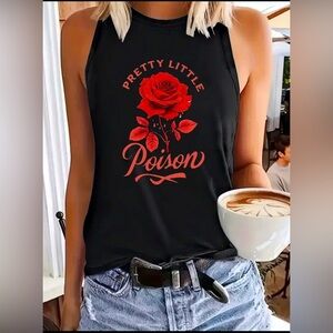 Women's Red Rose Floral Print Sleeveless Tank Top - "Pretty Little Poison" Graphic, Vibrant Pink Casual Round Neck Top, Comfortable Versatile Spring Summer Commuting Essential, Machine Washable, Ladies Tank Tops, Soft Comfortable Fabric, Daily Wear, Trendy Graphic, Breathable Material, Printed Blouse, Fashion Lovers