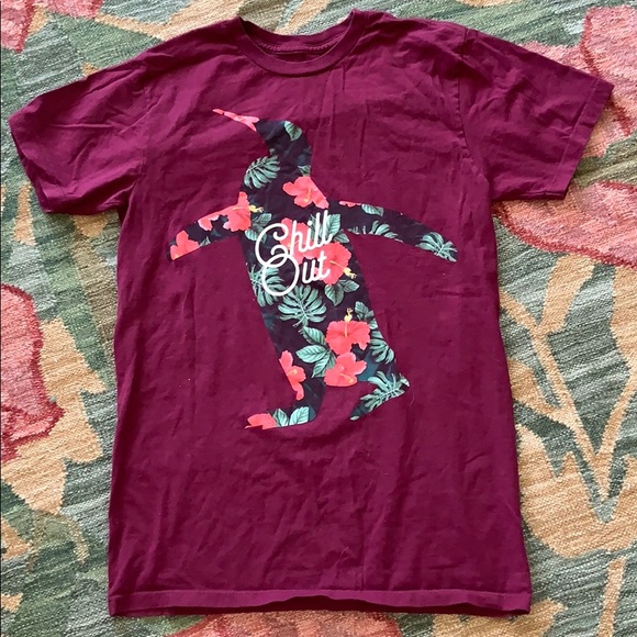 Comfy maroon T-shirt with Hawaii’s print penguin and ‘chill out’ gently worn no damage.
