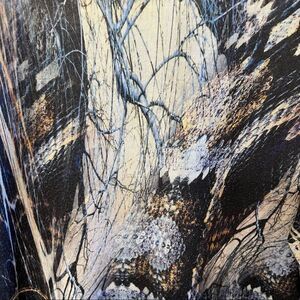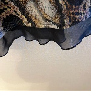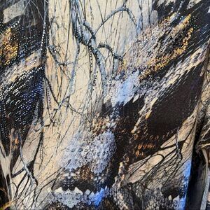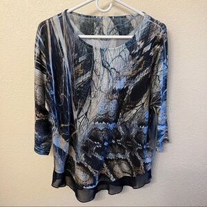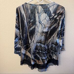 This graphic top has blue forest like pattern. The maker is unknown but it will be a great addition to your look. Along the bottom there is a sheer addition. (see photo) The size is medium. The measurements are 25” L x 21” W (pit to pit) x 21” sleeve (collar to cuff). The top is made out of polyester. The item does have a small hole in the sheer bottom. (see photo)