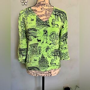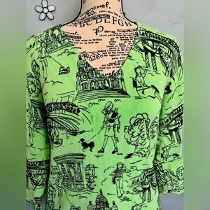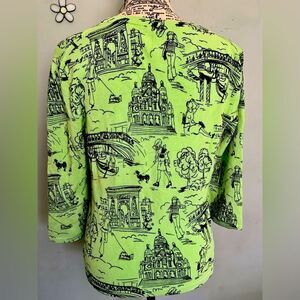 Bold green with black, dark green and red graphic prints of a girl and her dog in France.