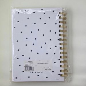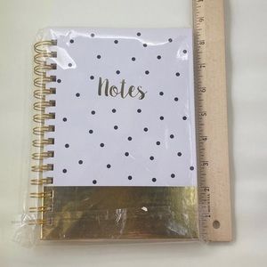 notebook. Gold spiralized spine, with hard front and back with black polka dots and gold details. “Notes” is written on the front in gold foiling.