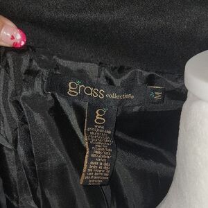 Chic black utility jacket with ruffled front. Features double-breasted button design. Ideal for stylish layering. Does not come with belt. Length 24 1/2", PTP 19"